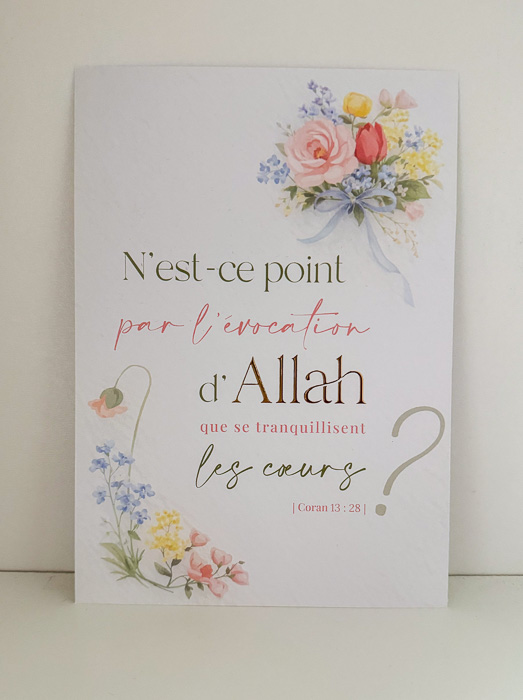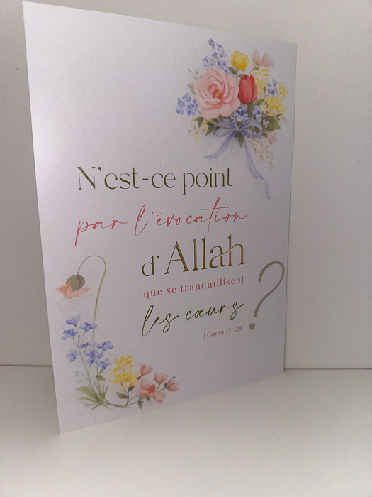 Home / Autour du Ramadan, Cartes de voeux, Coffrets Cadeaux & Eid Mubarak, Planner & Papeterie, Ramadan 2026, Tous nos produits / Carte de voeux Florale – « N’est-ce point par l’évocation d’Allah que se tranquillisent les cœurs ? »