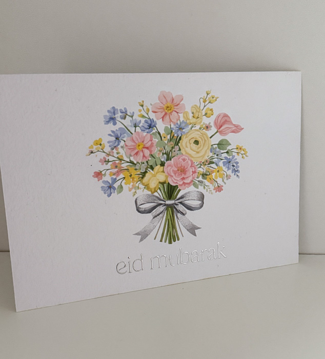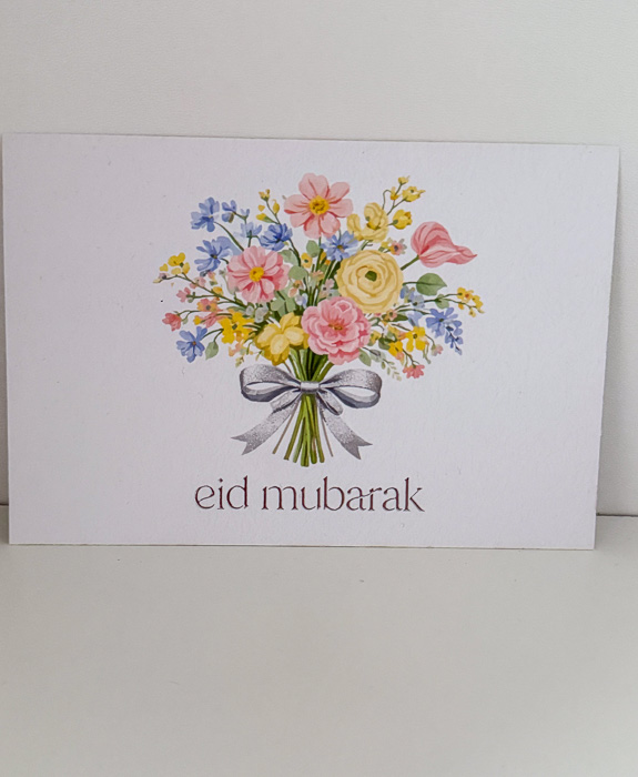 Son illustration florale douce, associée à une typographie raffinée, en fait une carte intemporelle, idéale pour célébrer Eid al-Fitr comme Eid al-Adha.