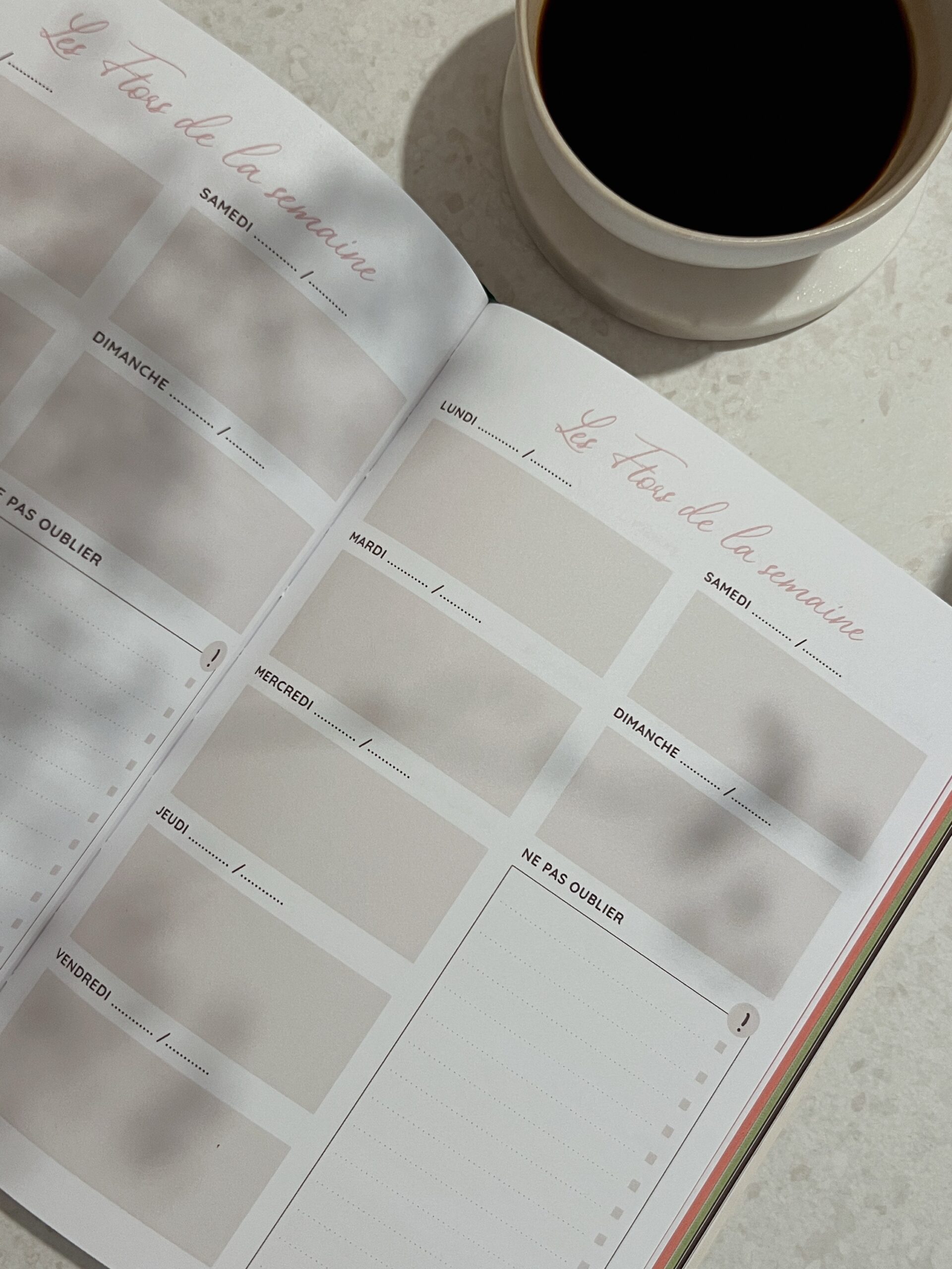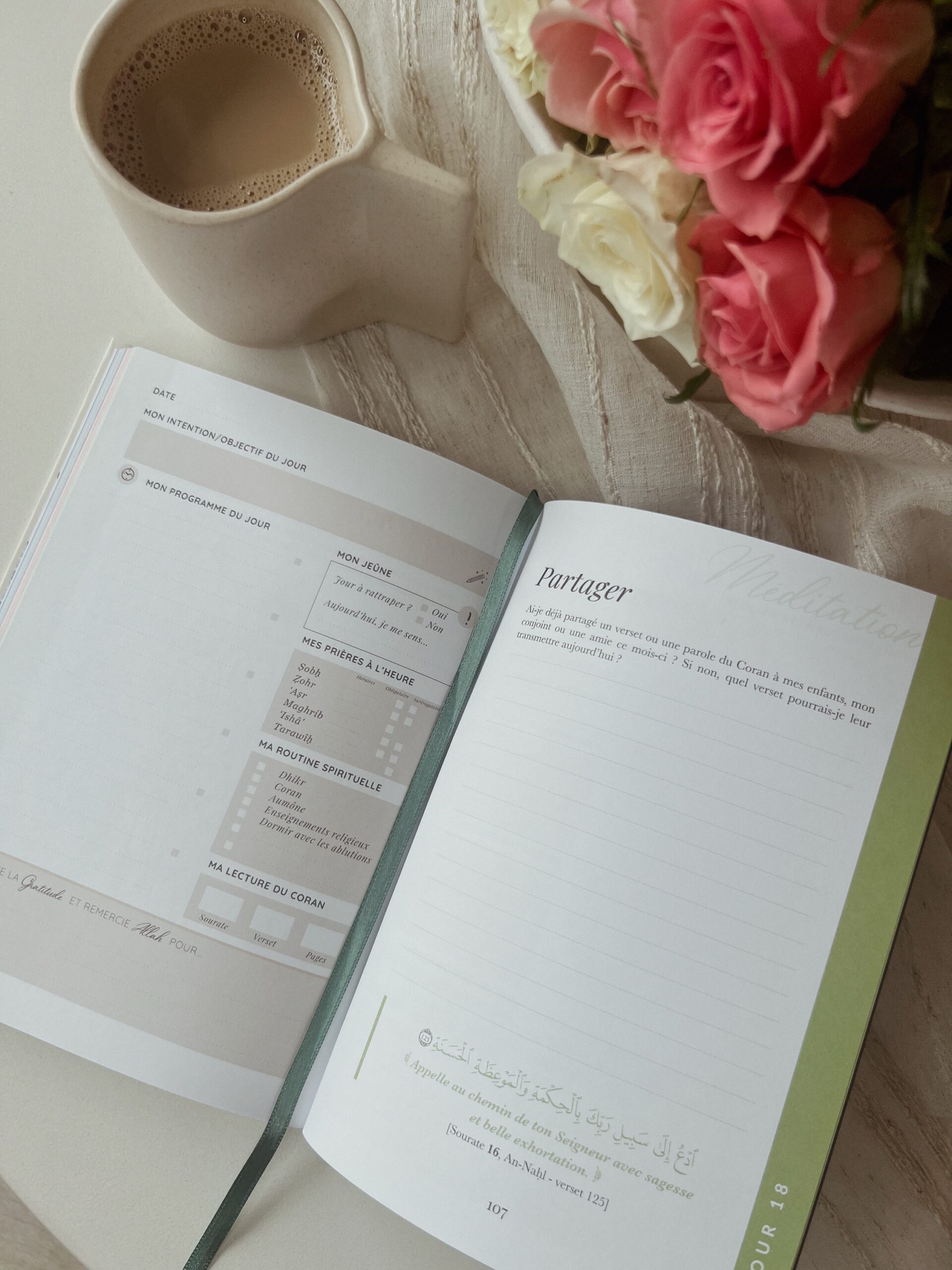 Ce journal se divise en deux sections journalières : l’une pour l’organisation de vos journées et vos actes d’adoration, et l’autre pour la méditation et la réflexion personnelle avec des articles et des exercices.