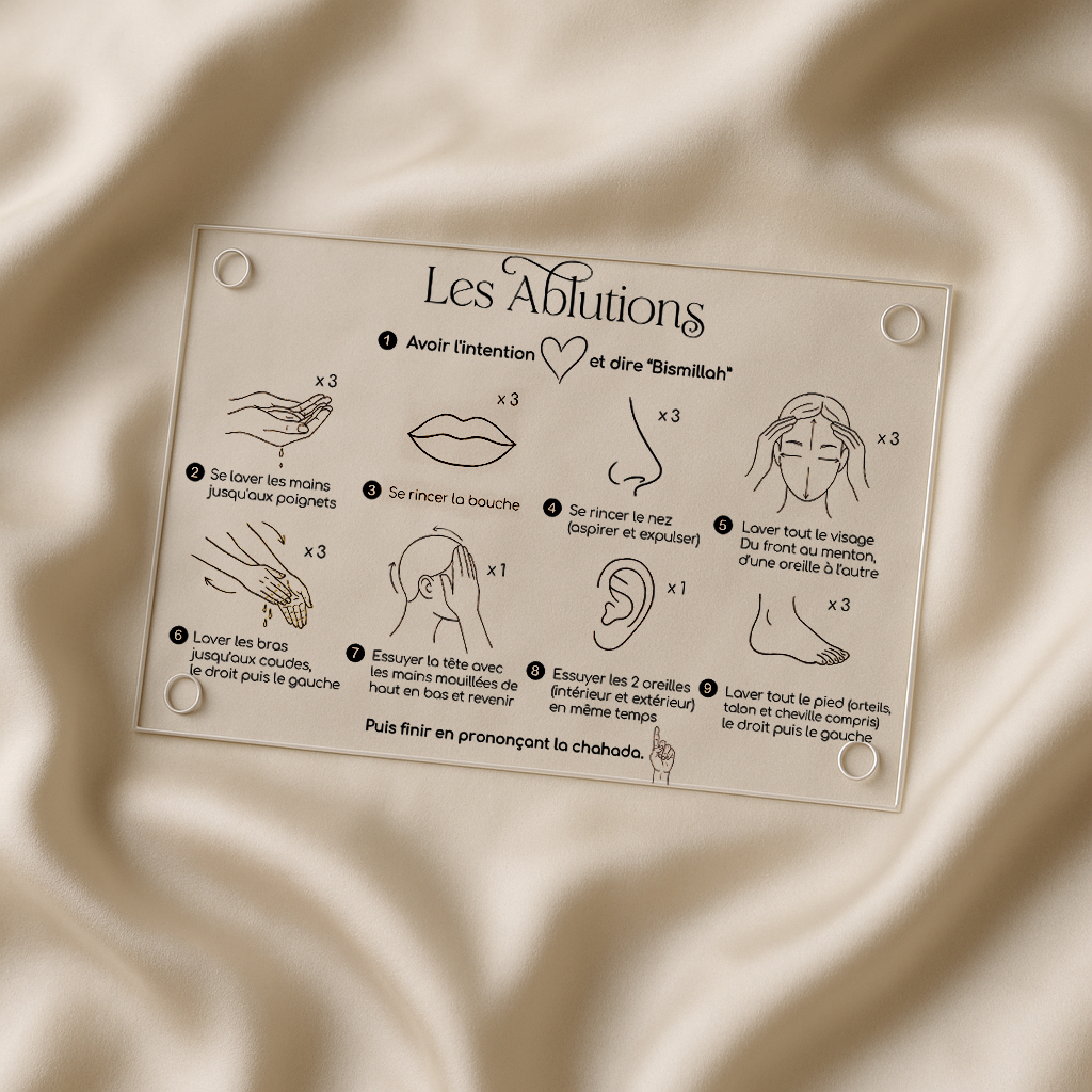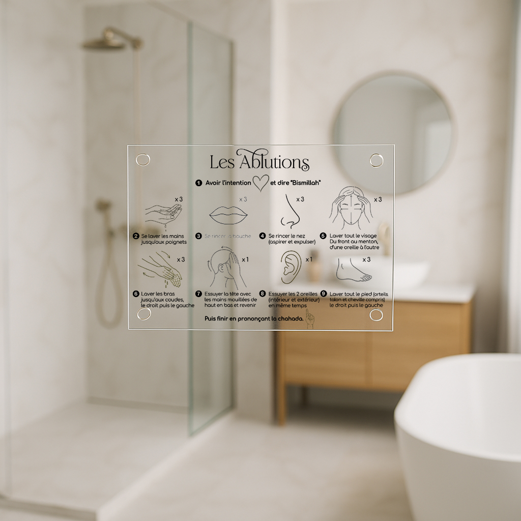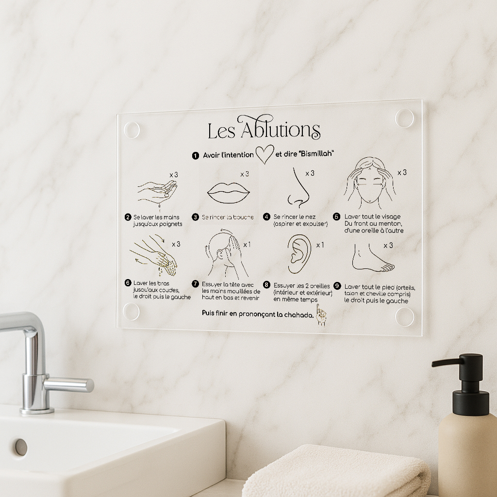 Plexiglass des Ablutions en Islam (Wudhu) – Panneau avec Étapes Illustrées | Panneau élégant pour salle de bain