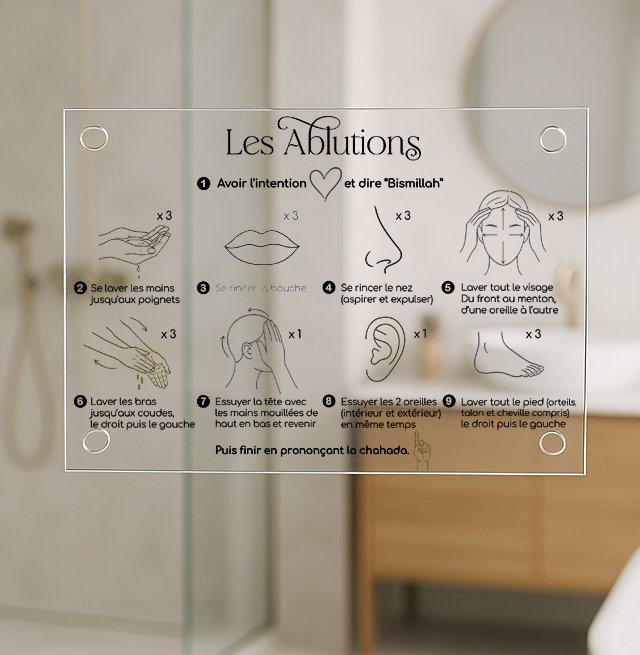 Ce panneau des ablutions (wudhu) a été conçu comme un rappel doux, visuel et bienveillant, à placer directement dans la salle de bain.